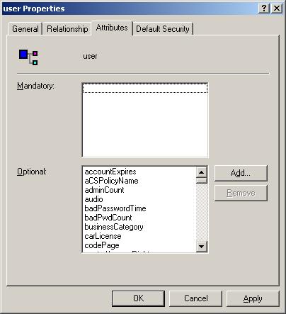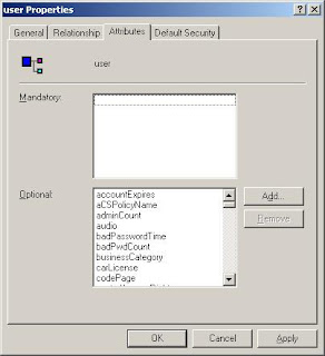 Modifying Schema AD for custom attribute Posted on February 3, 2011 by dpejic If for example you're asked to add a new attribute to the user class in your Domain, you can do this by modifying your AD Schema. Modifying AD schema is not always about adding new attributes, you can also add new class or modify existing ones and also activate or deactivate class and attributes. Before you make a modification to the AD Schema, you have to make sure that you're have the permission to do so. To check this, your account must be a member of the Schema Admin group. Microsoft has provides you a tool to make AD Schema modification. You can access this tool from the MMC. First, type the MMC on the Run command. This will bring you up the MMC window, go to File > Add/Remove Snap-in. Click the Add button. Choose the Active Directory Schema from the list and click Add (If you don't see the Active Directory Schema in the list, you have to regist it first by typing the 'regsvr32 schmmgmt.dll' at the Run command or at the command prompt). Click close and the Active Directory Schema utility will be added to the MMC. There's only one domain controller on which AD schema changes can be made, this domain controller is called the schema master. To be able to make changes to the AD schema, this tool must point to schema master. Right click on the Active Directory Schema entry in the MMC and choose Change Domain Controller. In this tool, you can create/modify, activate/deactivate classes or attributes. Let's say that you want to add another attribute to the user class. First, right click on the Attributes and choose Create Attribute, a dialog box will appear warning you that creating an attribute is a nonreversible action. Next, you will see the create new attribute dialog. Common Name This field becomes the Common Name attribute of the attribute. LDAP Display Name This is the string that the LDAP utility will display to users when they access the directory. Unique X.500 Object ID This is the OID you received from the ISO. ************* To obtain an OID, you need to run oidgen.vbs, which you can download from microsoft.com/technet/scriptcenter/scripts/ad/domains/addmvb03.mspx. The easiest approach is to run the .vbs file from the command prompt, then redirect the output to a text file. For illustration purposes, let's save oidgen.vbs to a directory we create in the root of the C drive, called OID. Next, open a command prompt and enter cd\OID to go to the OID directory. Then enter cscript oidgen.vbs >> OID.txt to place a file called OID.txt in the directory. (For these steps to work, you must be in the directory where you saved the oidgen.vbs file.) Running oidgen.vbs generates the following base OID, which we'll use throughout the rest of the article: 1.2.840.113556.1.8000.2554.14285.12046.9006.19529.38451.15381839.12108022. All classes will start with this number, ending in .1.n, where n is the class number. So the first class created will be 1.2.840.113556.1.8000.2554.14285.12046.9006.19529.38451.15381839.12108022.1.1. All attributes will start with the base OID and end in .2.n, where n is the attribute number. The first attribute will be 1.2.840.113556.1.8000.2554.14285.12046.9006.19529.38451.15381839.12108022.2.1. As a best practice, all the names of the classes and attributes you create should start with a prefix that contains your domain name. For example, if your domain name is Contoso.com, your prefix would be contosocom. Using your domain name as a prefix creates uniqueness across all your classes and attributes. In addition, your created classes and attributes will be easier to find amongst the hundreds of default ones. For more best practices, see the ***************** Description This optional field provides a short description of the attribute. Snytax is the data type of the attribute will hold, such as string, SID, OID, etc… Maximum specify the maximum value for the attribute Minimum specify the minimum value for the attribute Now, if you ever have to create a new class or attribute, you will need a unique Object Identifier (OID). There are a couple ways to get this OID, you can apply to ANSI which will take time and money (you will have the right to use any OID that starts with your OID) or you can use the script available here (copy the script and paste it into a file with an extension of .vbs or just simply named it oidgen.vbs, then just execute the file to obtain your OID). After filling all of the needed fields, click OK. Now, to add the newly created attribute to the user class, go to the click the Classes and search for the user class, right click on it and choose Properties. Go to the Attributes tab and click Add. Choose the attribute that you've created and click OK. Then you can verify that the attribute is listed in the optional attribute list box. The next thing is to give values to your new attribute. There are some ways to do this, but one of the way is buy using ldp.exe. It is a tool that is included when you install Windows Server 2003 Support Tools. With this tool you can search, modify, add, delete against LDAP server such as Microsoft AD. Just type ldp on the Run command. Click on the Connection then Connect. Type in the server location, this could be a dns name or ip address. Then just press OK. Next, we have to bind, click Connection then Bind. Type in your username and password which has the permission to modify user's attribute, then press OK. Then click Browse then Modify. In the DN textbox, type the DN for the user which you want to modify his/her attribute. For example, the DN for the administrator account would be something like this CN=administrator,CN=users,DC=srv1,DC=domain,DC=com. In the attribute textbox, type in the name of the attribute that you want to modify. For example, if you want to modify the givenName of a user, type in givenName. Type in the new value for the attribute that you want to change in the Values textbox. Press enter, you can add another new attri